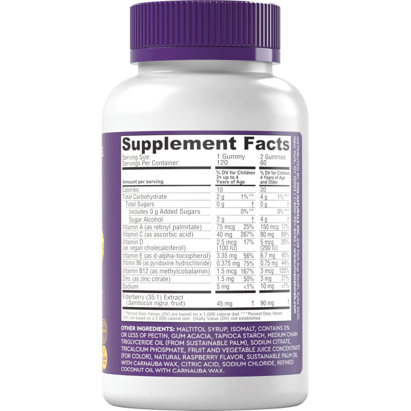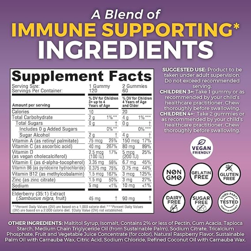 Elderberry Gummies for Kids - Introducing a delicious, sugar-free way to support your little one's immune system - an 8-in-1 immune supporting gummy for children* featuring elderberry, zinc, and vitamins A, C, D, E, B6 and B12 Packed with Purpose - Each ingredient has been carefully selected to support their immune health and function, support cellular defense, help maintain cell integrity and provide antioxidant-like support* Great-tasting Gummies - Who knew something so delicious could be good for kids immune support.* Our children’s elderberry gummies have a rush of raspberry flavor, plus they are sugar-free and easy to chew with no sticky residue Immune Support for Kids* - Support your little one’s immune system with our elderberry vitamin c and zinc gummies.* Each bottle offers 120 gummies, providing up to 4 months of immune support gummies * Quality You Can Trust - Our elderberry immune support gummies are Non-GMO, gluten-free, dairy-free, gelatin-free, sugar-free and third-party tested, so you can feel good about what your little one is taking*